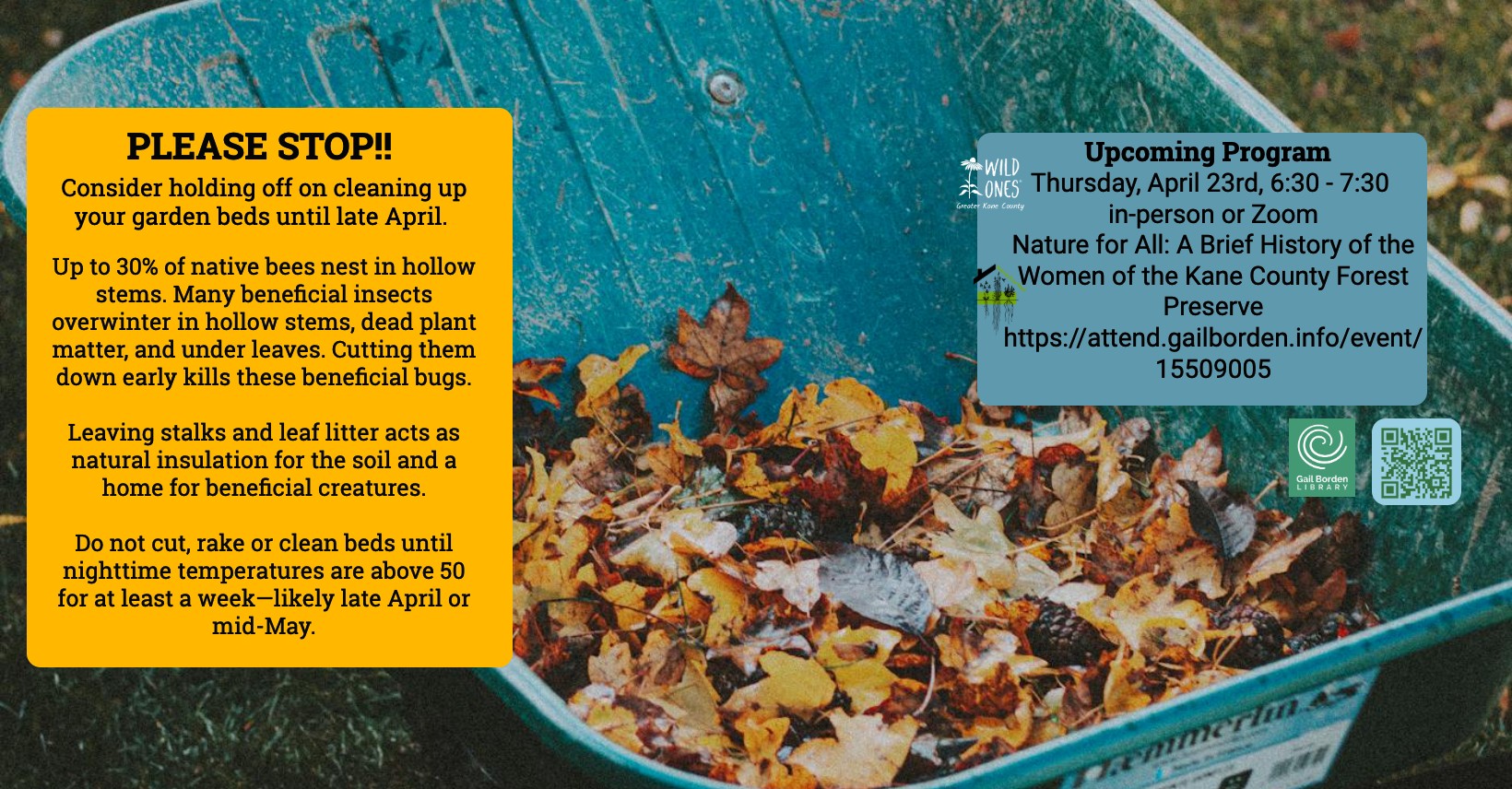 We have an initiative called Start in Your Yard. We are here to help you started with native plants in your yard or garden plot. There are ideas and videos to watch on our website. You can also click the “register your interest” button, and we will send a few seasoned gardeners out to work with you as you plan your native garden. This is available for free for members and non-members. Go to: http://startinyouryard.com